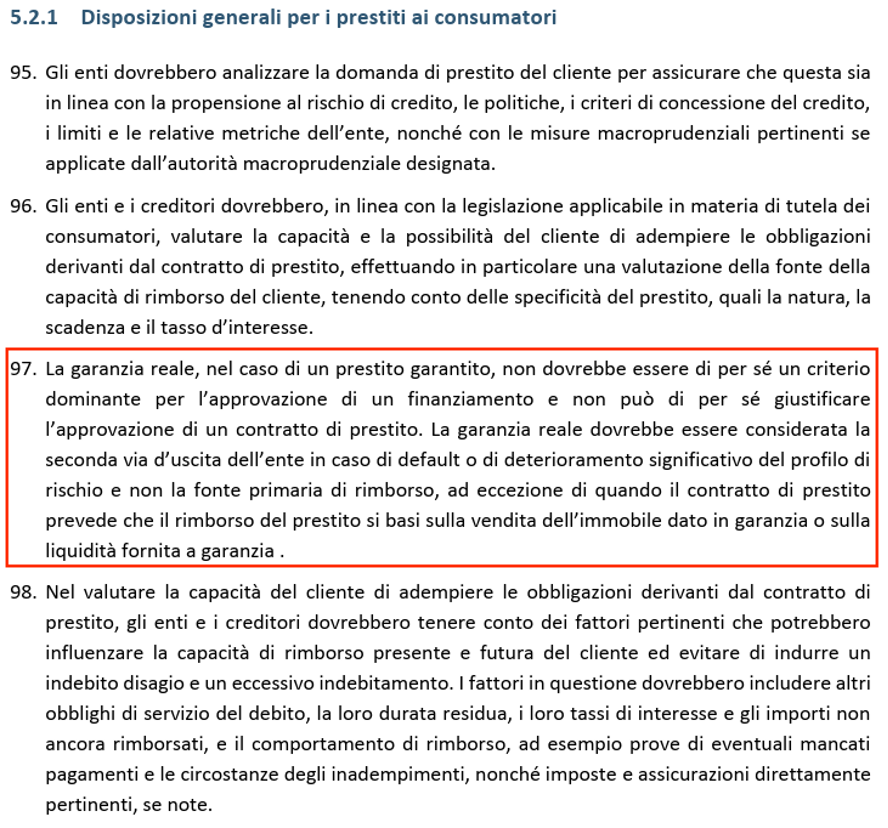 Tuttavia, la fattispecie risulterebbe in contrasto con le Linee Guida EBA sulla concessione e monitoraggio del credito (EBA/GL/2020/06): al paragrafo 97 in particolare, esse non prevedono erogazione basata solo su garanzie reali, in luogo dell’esame della solvibilità del debitore principale.