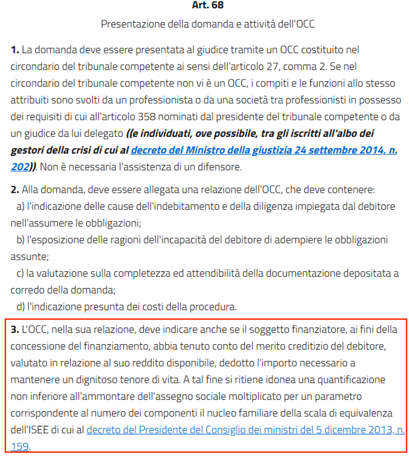 Esaminiamo ora le disposizioni dell’articolo 68 e in particolare del comma 3. Il medesimo articolo, ai fini di acclarare eventuali responsabilità del finanziatore, impone all’OCC (Organismo di Composizione delle Crisi da sovraindebitamento) di verificare le condotte dei finanziatori del consumatore.