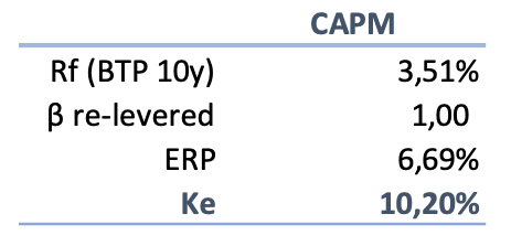 Il cost of equity, cioè il tasso di attualizzazione da utilizzare nel DCF, è del 10,20%.