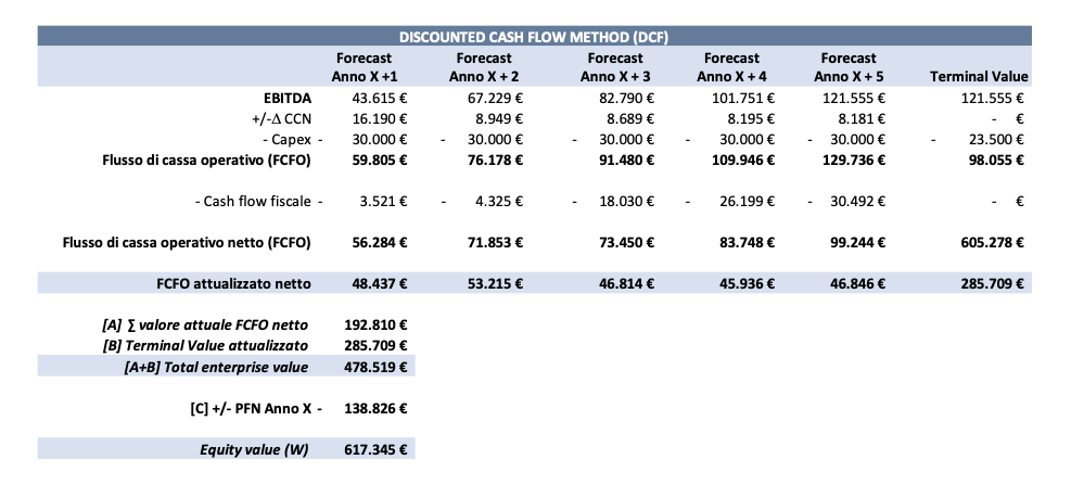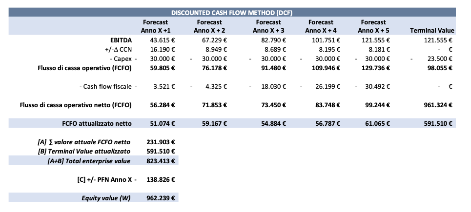 Applicando la metodologia del DCF, i cui fondamenti tecnici sono approfonditi nei nostri moduli didattici dedicati (dateci un occhio), si determina un valore del capitale proprio (Equity Value) pari a 962.239€.