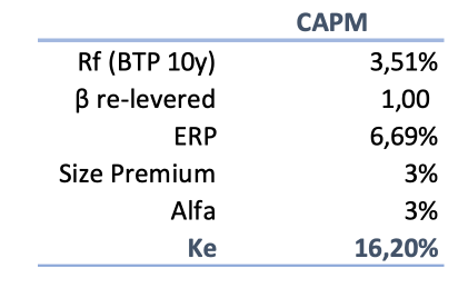Il modello CAPM viene dunque integrato con una maggiorazione complessiva del 6%, ripartita tra un 3% a titolo di Size Premium e un 3% (Alfa) quale somma dei premi per illiquidità e rischi specifici.