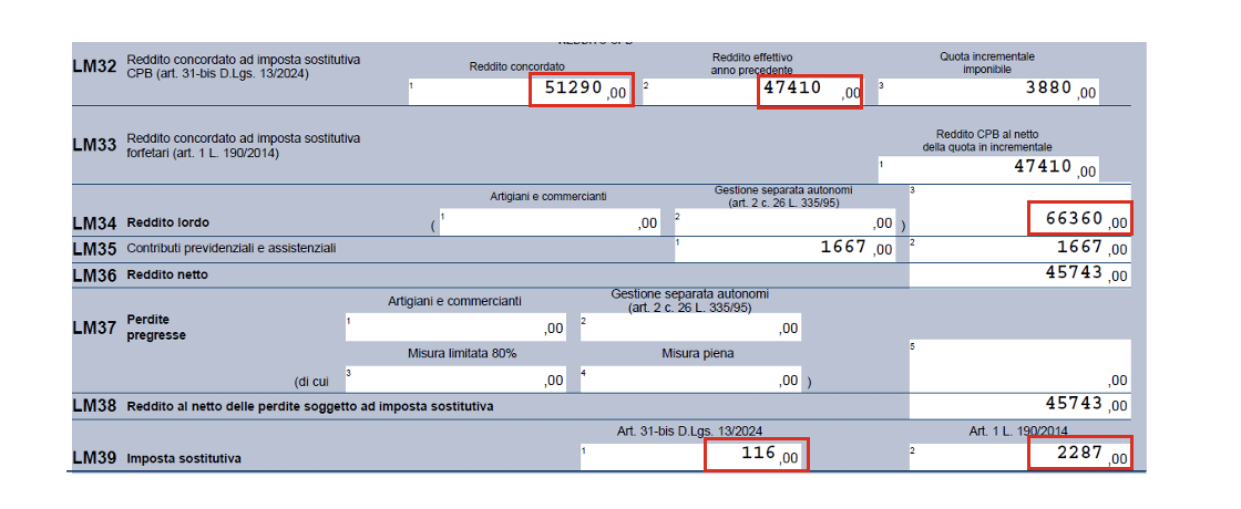 Il reddito effettivo per il periodo d’imposta di riferimento è pari a €66.360 (lo avevate già notato al rigo LM34), quindi per il contribuente non vengono pagate le imposte sull’eccedenza del reddito concordato (66.360 – 51.290 = €15.070 * 5% = 753,5). Il risparmio effettivo è di €831,5 (78+ 753,5).