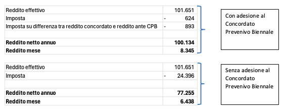 Ergo, il reddito disponibile in caso di adesione al Concordato è più alto in quanto vi è il risparmio d’imposta di €832.