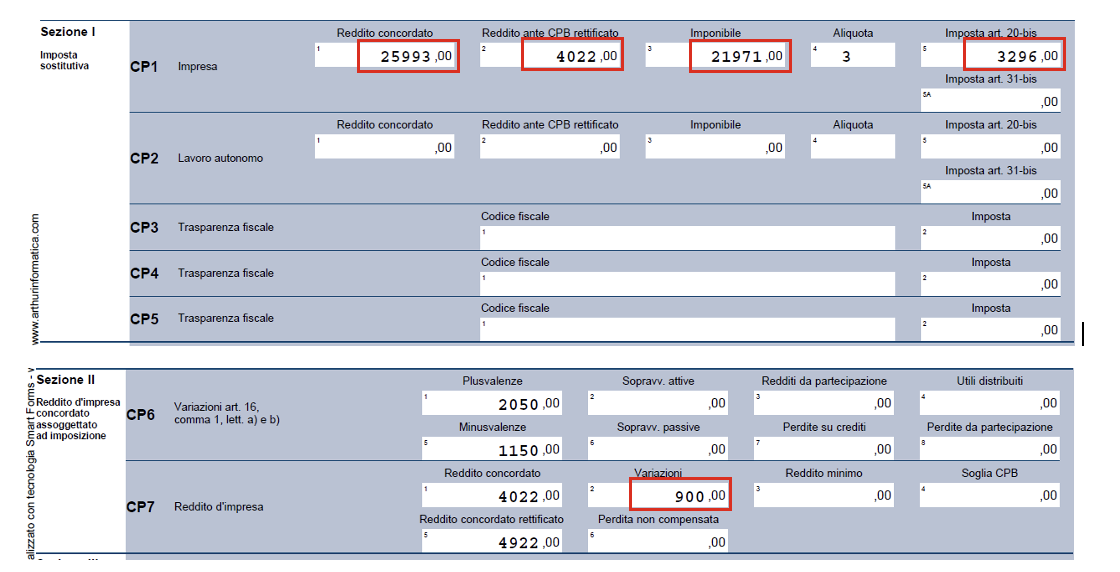 Dal rigo CP1 rileviamo un reddito concordato di €25.993 e un reddito relativo all’anno precedente di €4.022, l’imponibile su cui viene applicata l’imposta sostitutiva è quindi pari alla differenza ovvero €21.971.