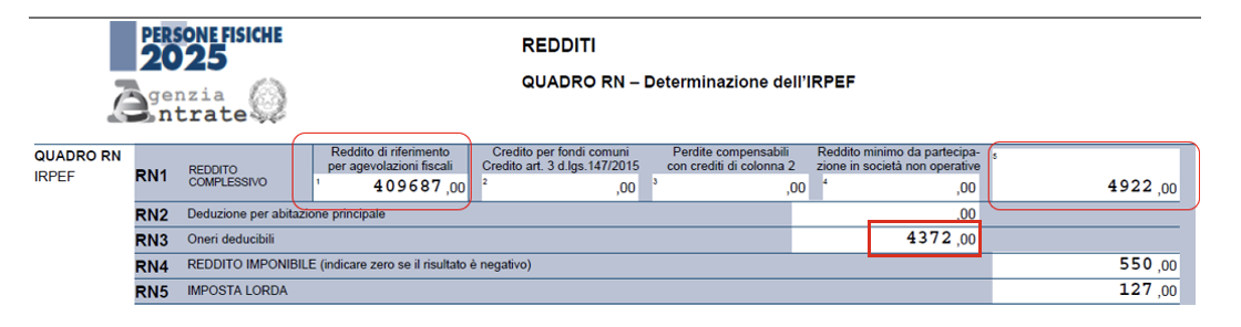 Sottraendo gli oneri deducibili dal reddito di €4.922 dell’anno precedente + altri redditi, otteniamo un reddito imponibile €550 che al 23% conduce all’imposta di €127 già in precedenza calcolata. L’imposta dovuta complessivamente è quindi di €3.423 (+127€+3.296€).
