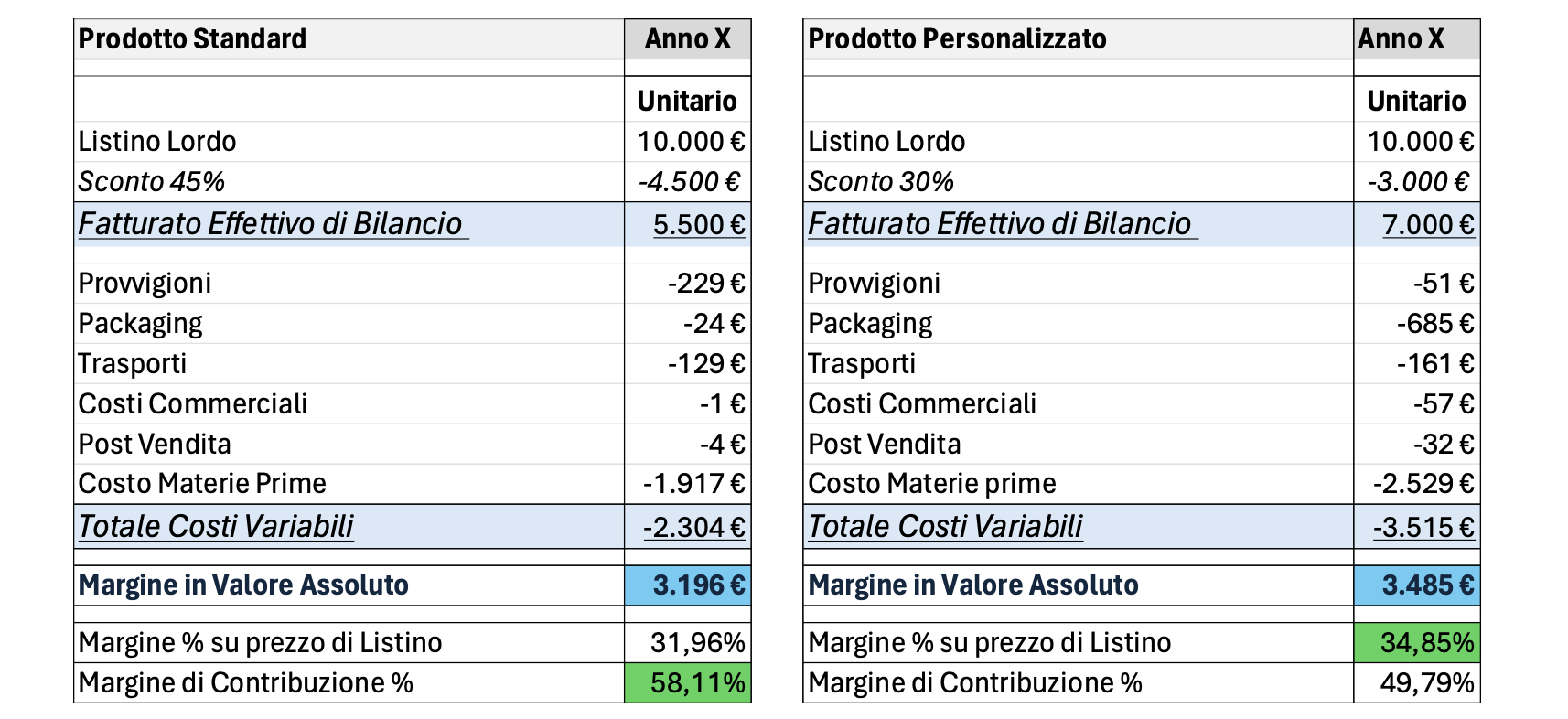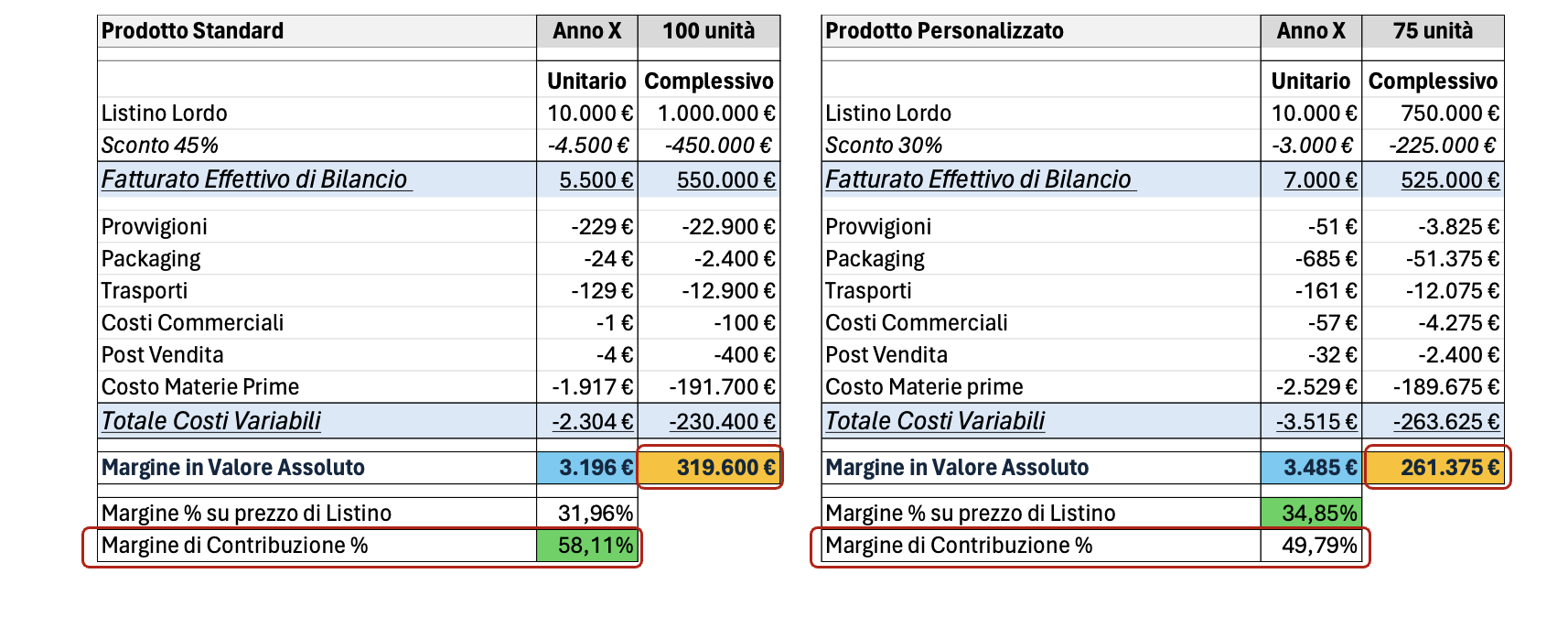 Chi ha quindi ragione? Il responsabile commerciale afferma: “Scusate, ma preferite guadagnare 3.485 € col prodotto custom o 3.196 con lo standard? Il margine su listino ci dice che è meglio portare a casa il prodotto custom!”